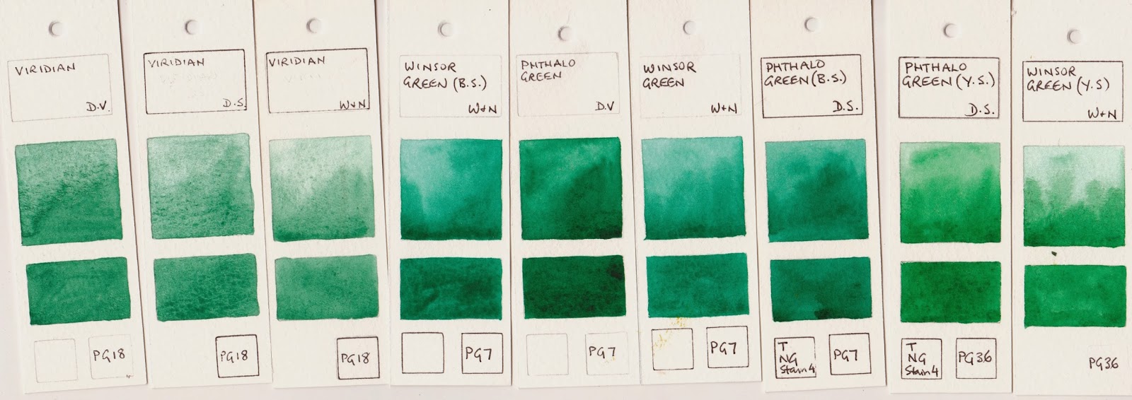 There are many single pigment greens. Some are transparent and/or staining. Others are granulating. The advantage of using single pigment greens is that you don't have a multitude of pigments in the mix if you then mix them with other colours.Below are 3 examples of Viridian on the left. I prefer the DaVinci or W&N. The Daniel Smith version is a disappointment and doesn't rewet well - best used fresh or add some glycerin to the paint well and stir if setting up in a palette. Viridian is a softer, granulating and liftable version of Phthalo Green. It is lovely for florals but doesn't have the power of phthalo green PG7, which is a very staining pigment.